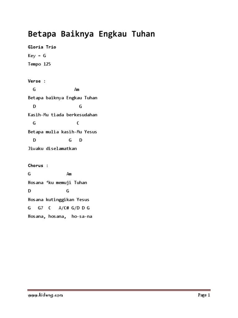 G Am Betapa baiknya Engkau Tuhan D G Kasih-Mu tiada berkesudahan G C Betapa mulia kasih-Mu Yesus D G D Jiwaku diselamatkan Chorus. Betapa Baiknya Engkau Tuhan Betapa baiknya Engkau Tuhan KasihMu tiada berkesudahan Betapa Mulia KasihMu Yesus Jiwaku diselamatkan Hosana kumemuji tuhan Hosana. Hosana ku memuji Tuhan.